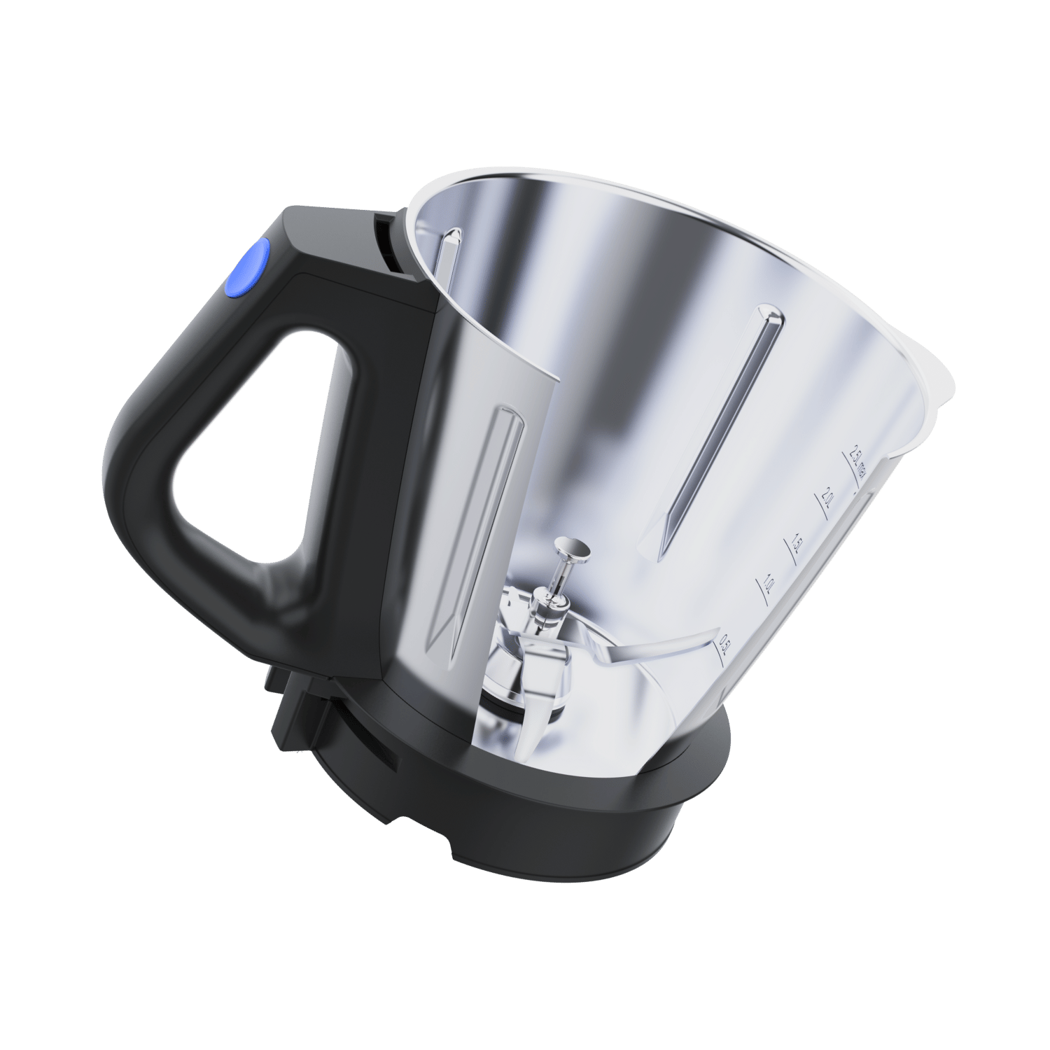 La jarra, diseñada específicamente para la inducción, presenta un triple recubrimiento de acero y aluminio. Equipada con una tapa que facilita la inserción gradual de alimentos, un práctico vaso medidor y una cuchilla de cuatro hojas de acero inoxidable de alta calidad, que se puede extraer fácilmente para su limpieza. Además, cuenta con un mango con un sistema de anclaje seguro para mayor seguridad.