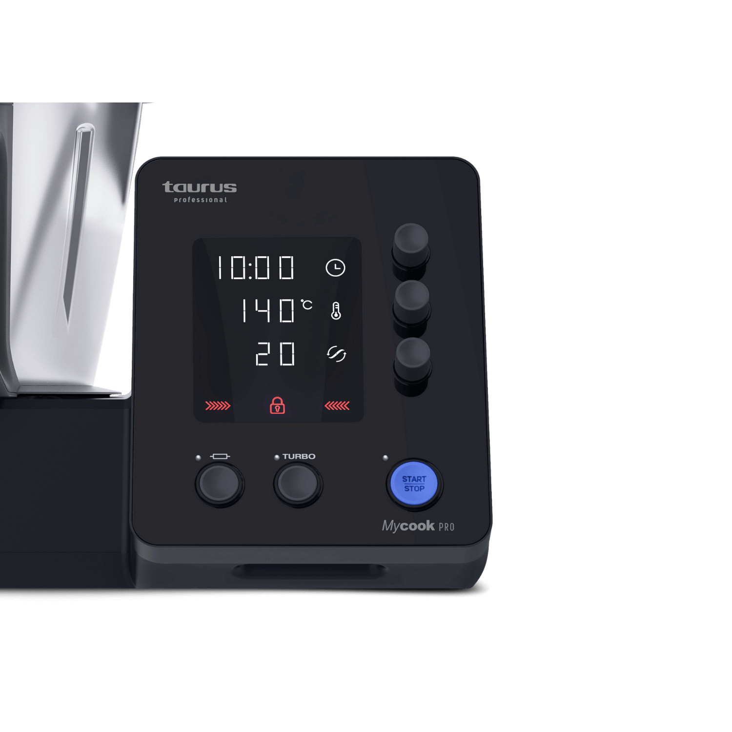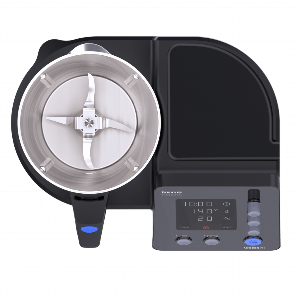 Mycook Pro mezcla, pica, cuece, emulsiona, amasa, pulveriza, muele, bate, sofríe y cocina a baja temperatura con precisión y regularidad, adaptándose a las necesidades de una cocina profesional.
